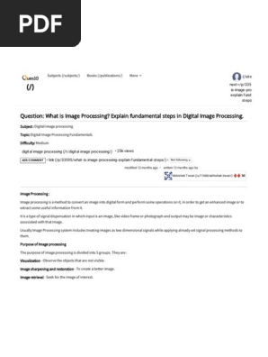 Image acquisition could be as simple as being given an image that is already in digital form. 3 HOURS 1 Question 1 is compulsory. Read Full. Image acquisition could be as simple as being given an image that is already in digital form. Image Acquisition Image Restoration Morphological Processing Segmentation Object Recognition Image Enhancement Representation Description Problem Domain Colour Image Processing Image Compression Wavelets Multiresolution processing Knowledge Base Outputs of these processes generally are images. Fundamental Steps in Digital Image Processing 41 42. Mumbai university digital image processing updated 48 years ago by Juilee 66k.